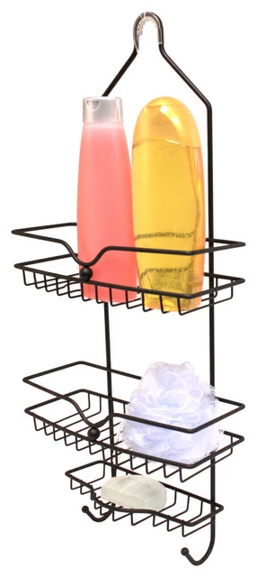 Rustic shower caddy provides extra space in the shower, keeping shower essentials off the floor and organized in an easy to access hanging caddy. Classy rustic finish in a modern twirl design two shelf caddy, includes two hooks for loofahs and accessories and separate soap dish.