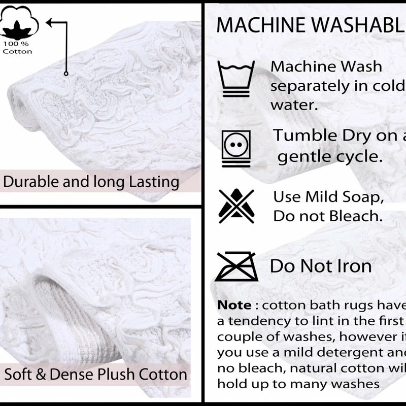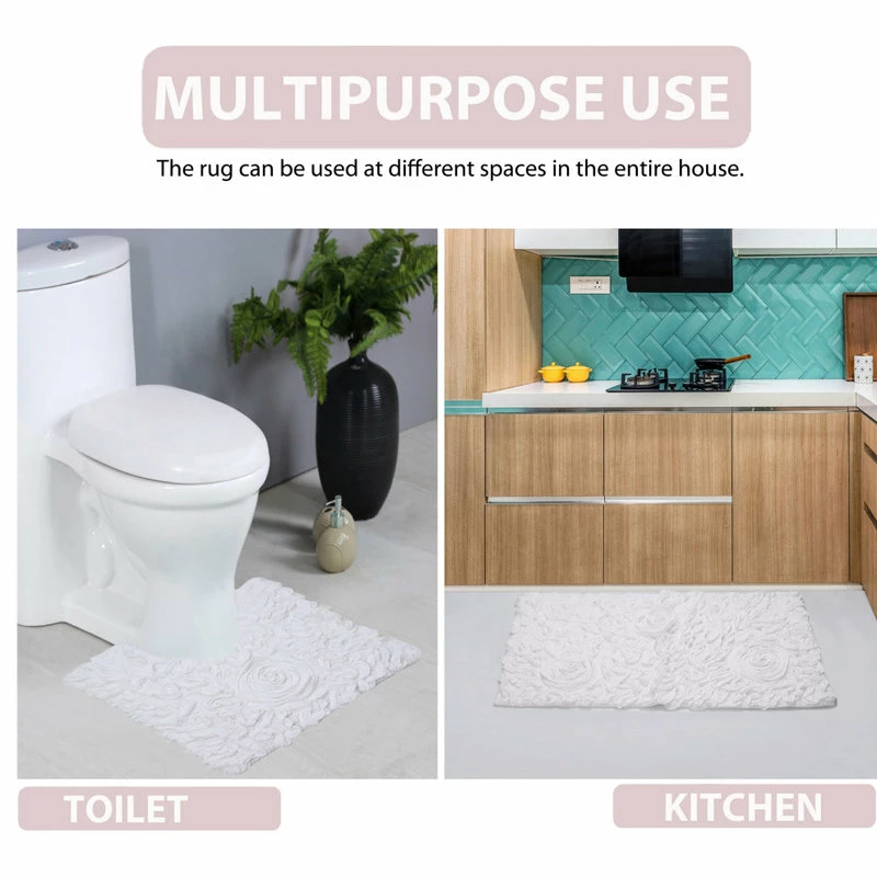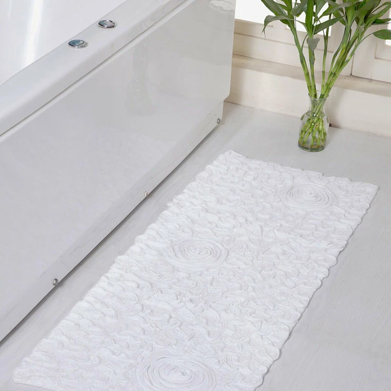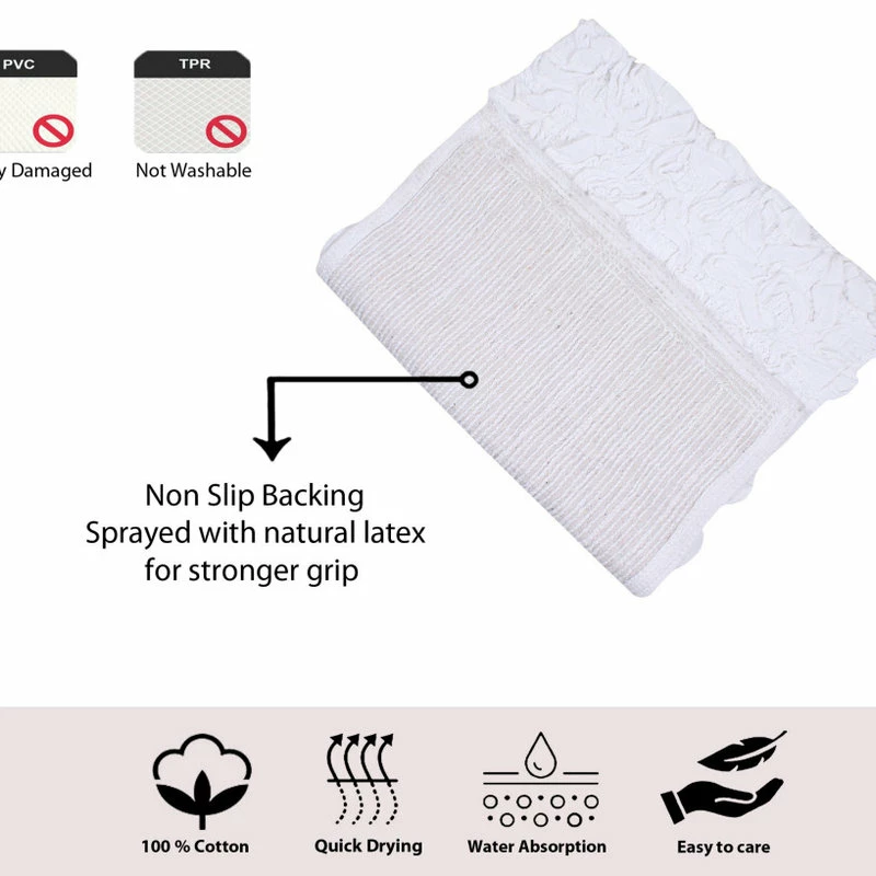 Bring elegance home with this Bellflower Bath Rug. This lovely bath rug features dainty roses on a soft solid colour background. This beautiful bathroom rug is both functional and durable. It adds a sense of luxury to your bathroom space while helping to keep your floor dry after showers. Crafted from pure cotton, it has extraordinary absorbency. This tufted rug comes with slip-resistant spray latex backing that keeps the rug stay put as you step out of the shower or into the tub. This tasteful rug is machine washable, thus easy to maintain. The rug is available 6 different colours to match your bathroom interior.