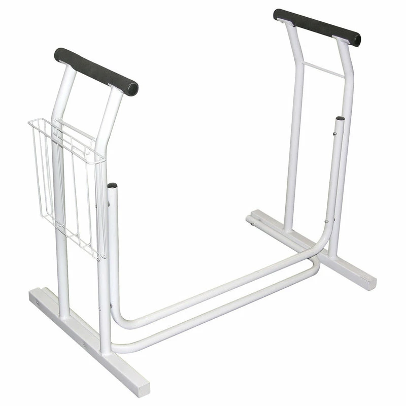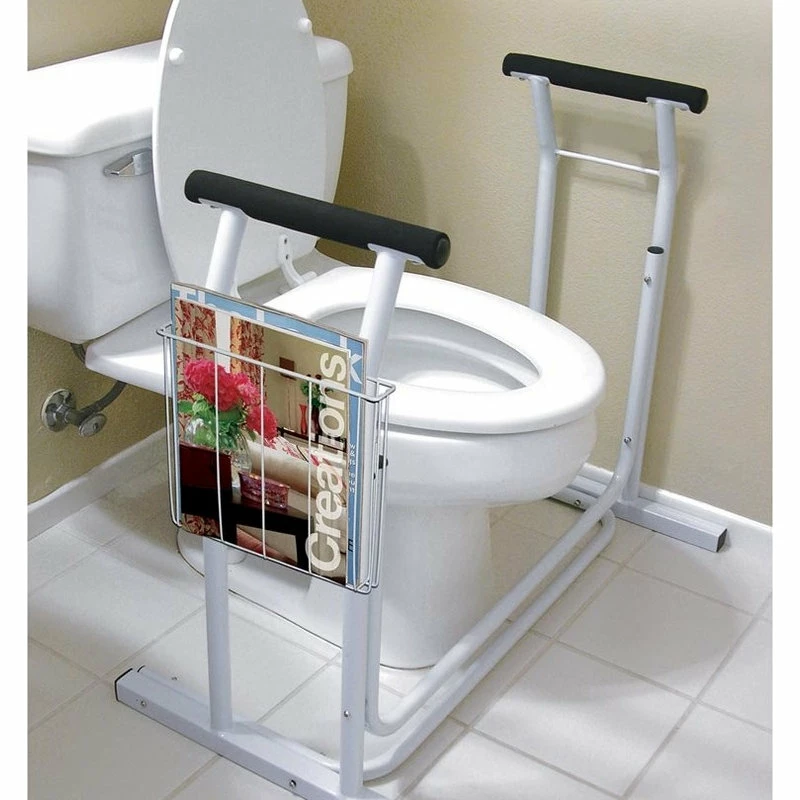 - A hand up where you need it most. This Toilet Seat Safety Frame has slip resistant padding, sturdy arms and supports up to 300 lbs. Features comfortable padded handles and even includes a handy magazine rack. Steel. 26 1/4″ H x 19 1/2″ W x 19″ D. Requires some light assembly.