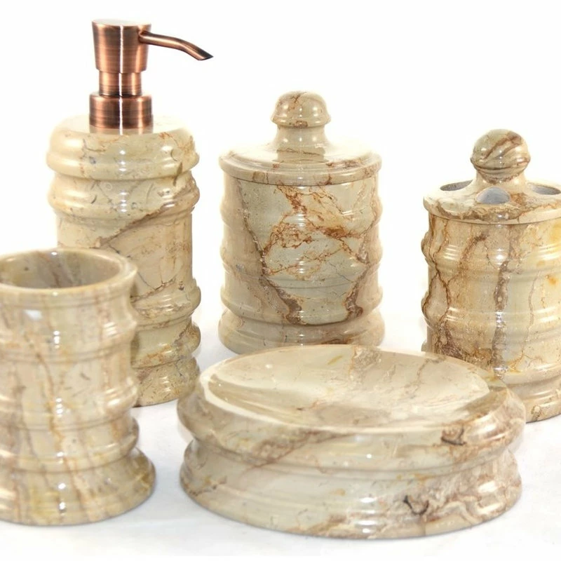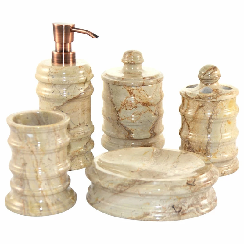 Popular Sahara Beige Marble has been used in crafting this five piece bathroom accessory set. It is a Nature Home Decor exclusive design.