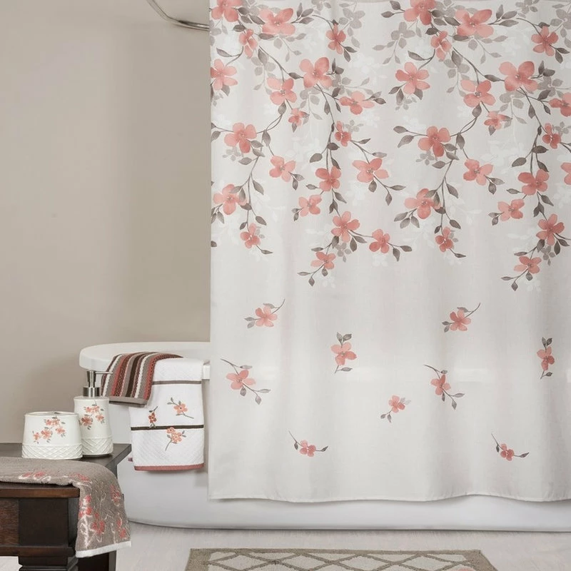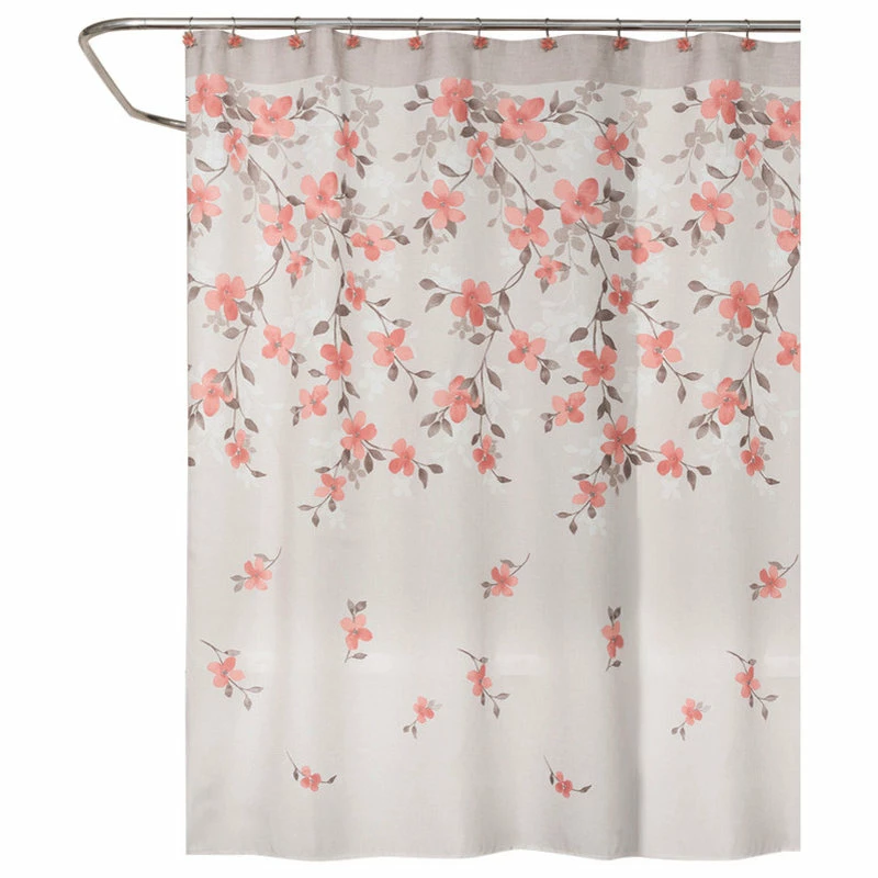 Coral Garden Shower Curtain Floral is a polyester curtain with coral and cream colored flowers drifting to earth in a tranquil trail on a field of taupe. This beautiful print gives anyone’s bathroom the feel of a serene spring garden no matter what the weather. It goes beautifully with the rest of the Coral Garden collection.