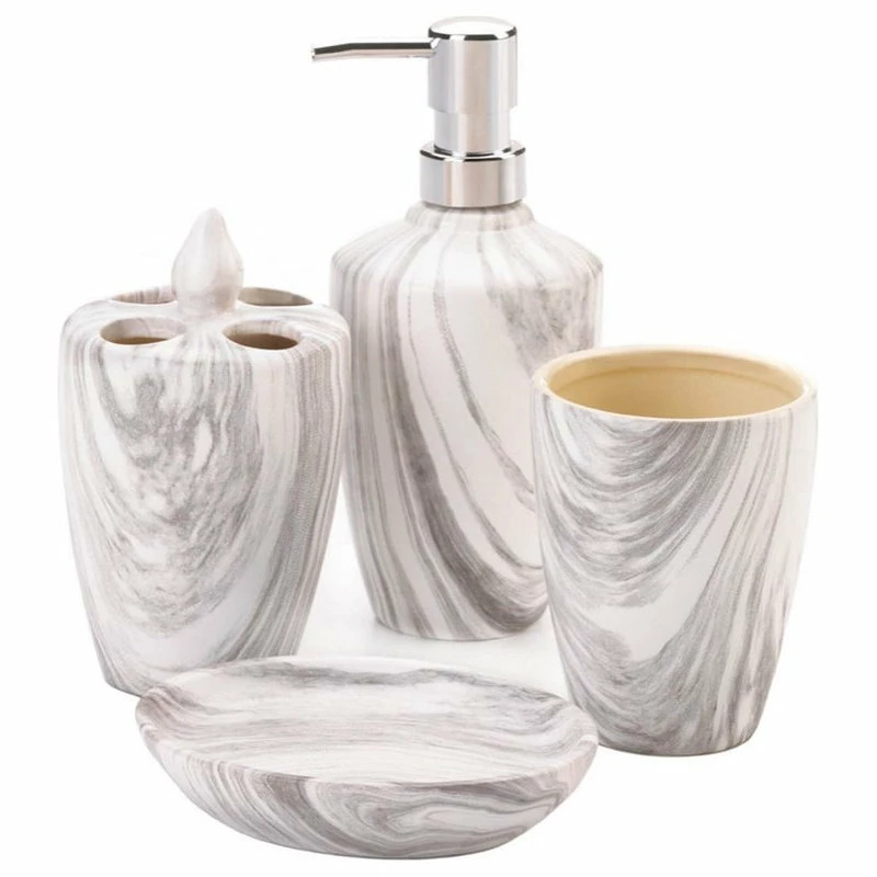 - This four piece bathroom accessory set makes it easy to enhance bathroom space! Place on your counter, shelf, or cabinet as a stylish addition